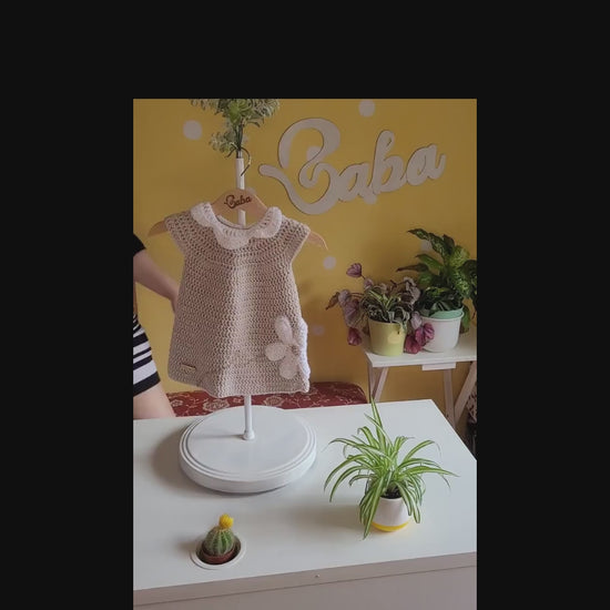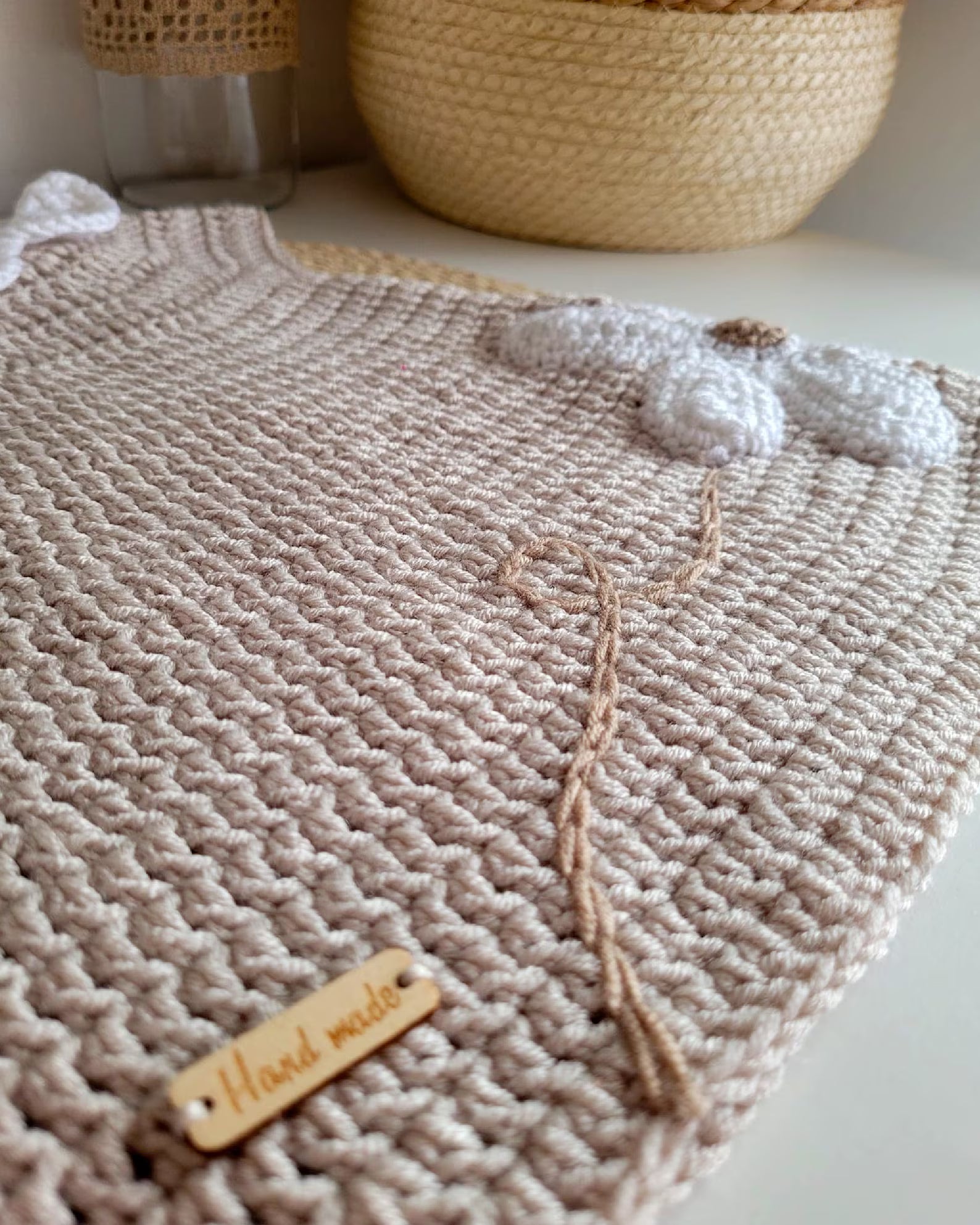 A perfect blend of vintage charm and modern flair, this crochet pattern features a round yoke, sweet collar, and a bold floral appliqué 🌼 — all designed to make your child stand out!
