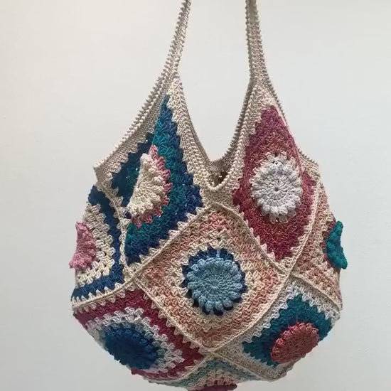 Make a statement with this stunning diagonal granny square shoulder bag! Perfect for advanced crocheters who love color and texture πŸ’™πŸŒΈ