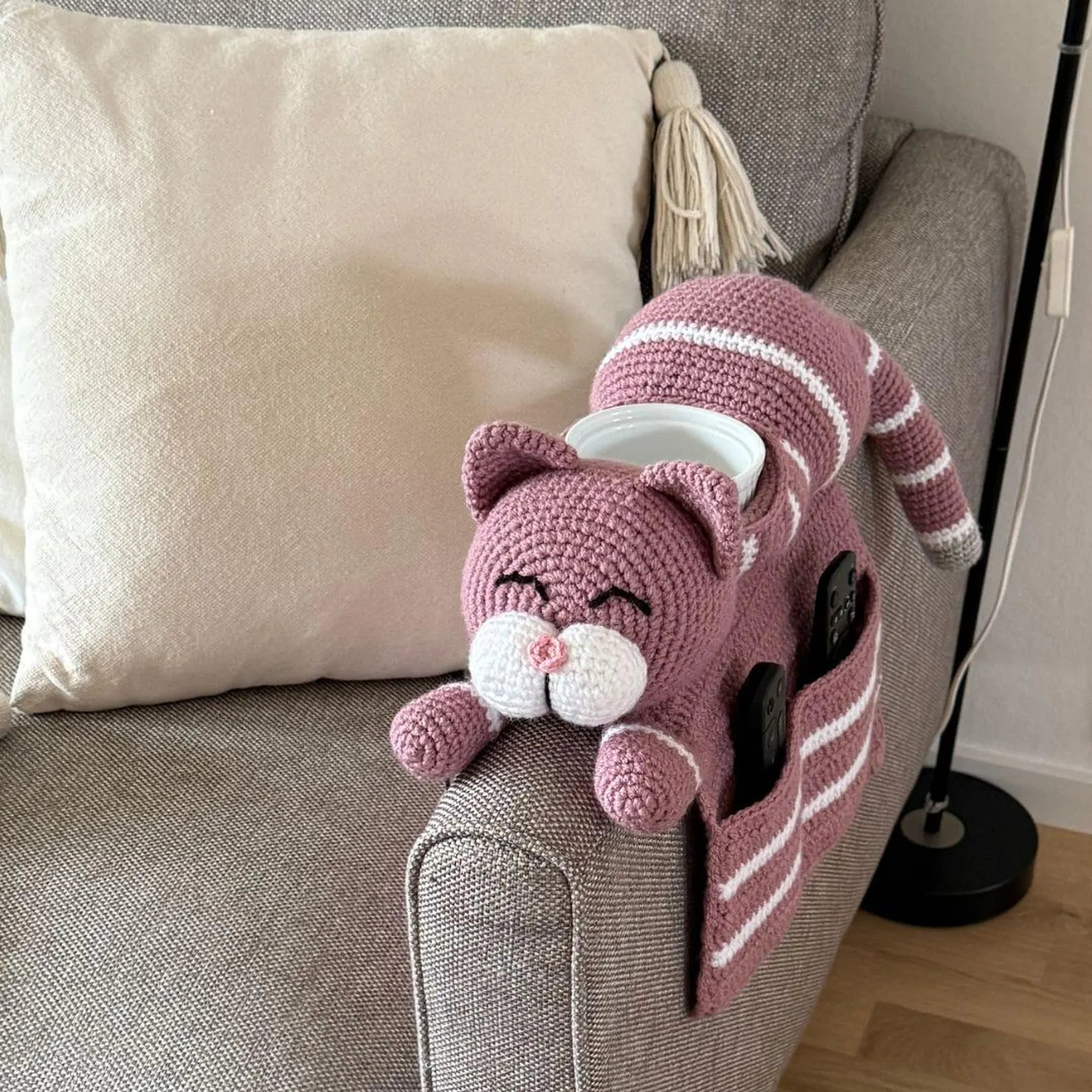 🐱✨ Crochet your own adorable sofa buddy! This Cat Sofa Organizer is not only cute but also super practical — holding your remotes, glasses, or small items while adding a cozy handmade touch to your living room. 🛋️💕